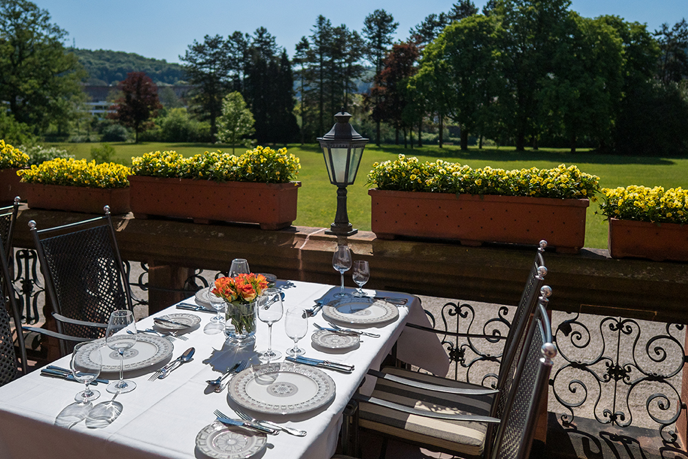 Bei schönem Wetter lädt die Schloss-Terrasse ein, den Blick über den Park und die angrenzende Saar schweifen zu lassen.